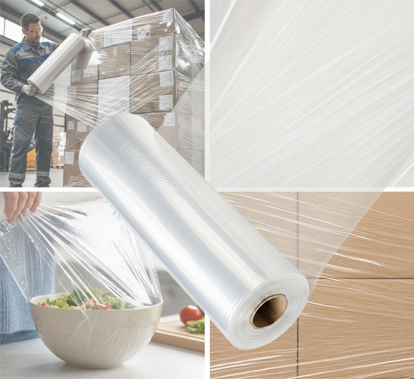 - Proprietati: Datorita elasticitatii, straturile de pelicula se lipesc strans unul de celalalt fara clei, creand un cocon ermetic. Transparenta permite vizualizarea continutului marfii si scanarea codurilor de bare. Potrivita pentru ambalare manuala si automata.