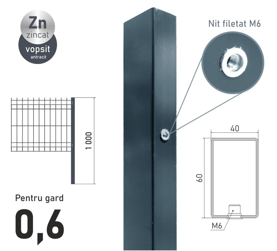 Столб оцинкованный ЕСО 06 (60х40x1,2) L-1,0м крашенный RAL7016